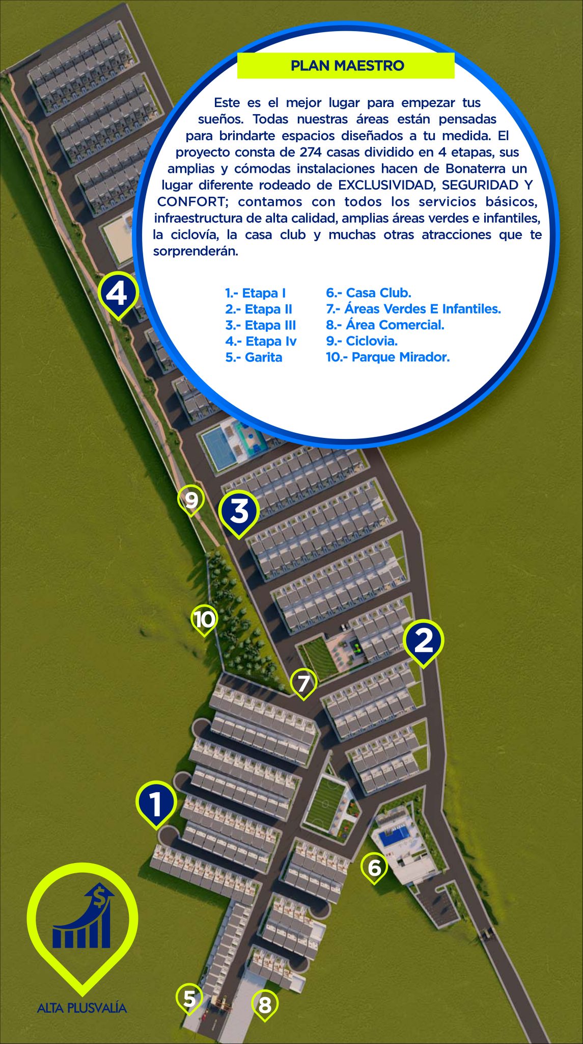 - Comunidad Exclusiva: 274 casas distribuidas estratégicamente en 4 etapas.